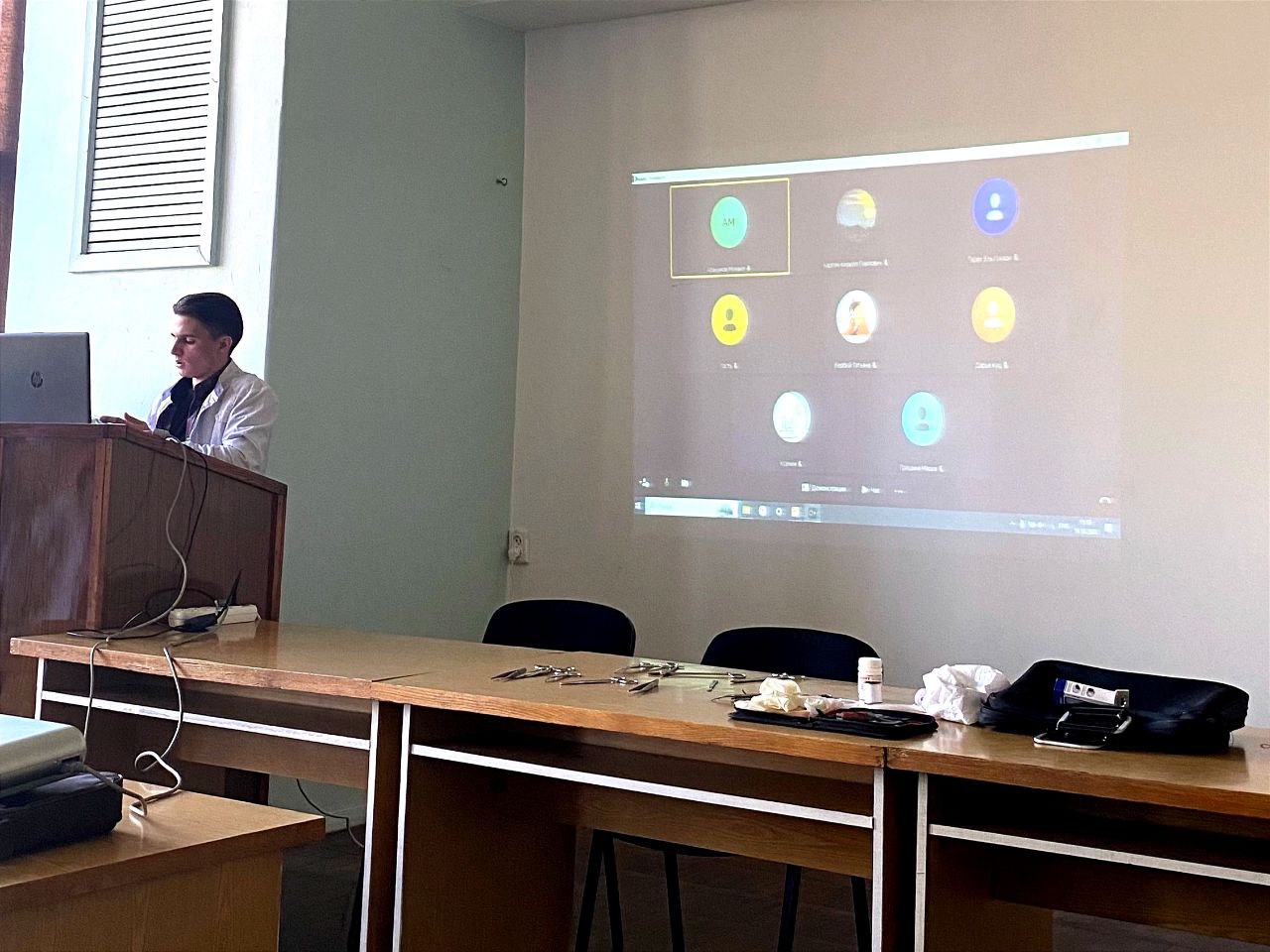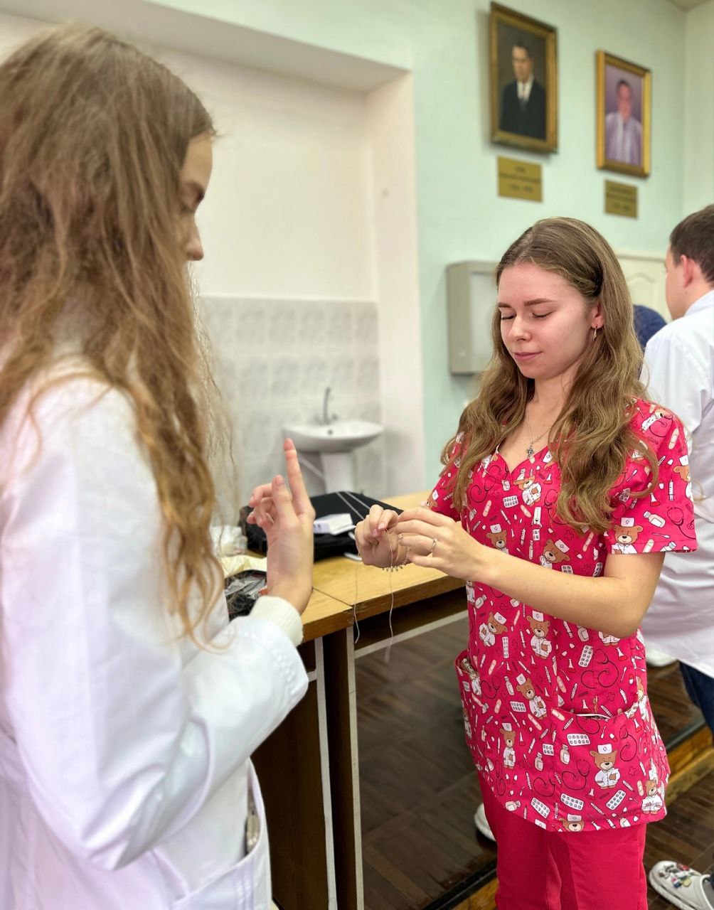 Заседание включало 2 этапа: работа с докладами, разбор теоретического материала, обсуждения особенностей в педиатрической деятельности, а также практическая часть, где студенты приобретали и отрабатывали навыки по общей хирургии.