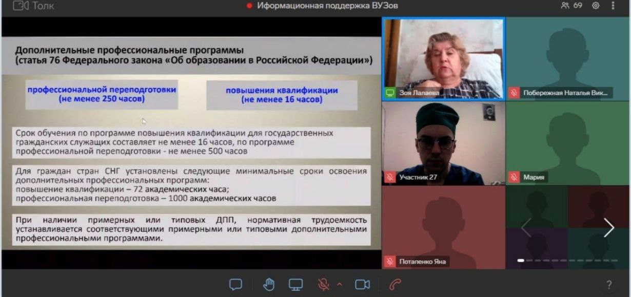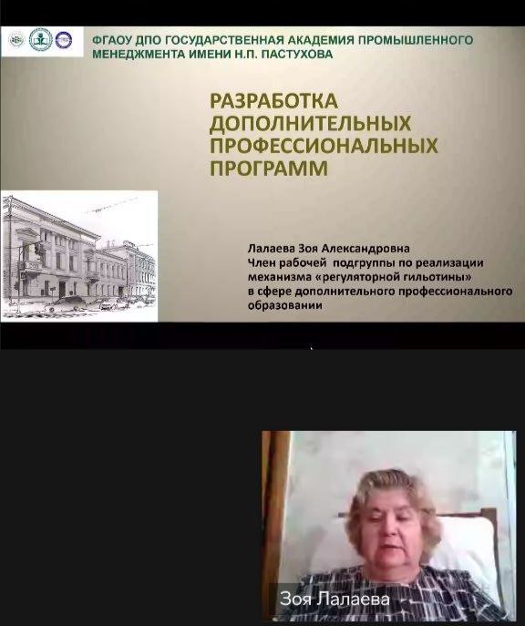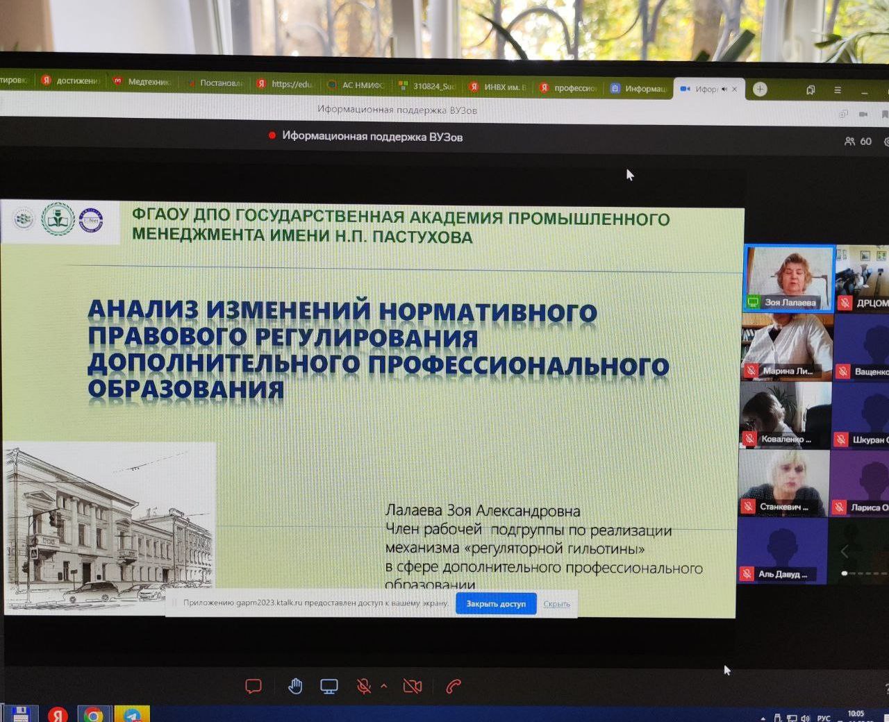 Представители профессорско-преподавательского состава и учебно-вспомогательного персонала приняли участие в трёх вебинарах, организованных ФГАОУ ДПО «Государственная академия промышленного менеджмента имени Н. П. Пастухова» по информационной поддержке вузов новых субъектов РФ при организации и осуществлении образовательной деятельности дополнительных профессиональных программ по следующим темам: «Анализ изменений нормативного правового регулирования дополнительного профессионального образования», «Разработка дополнительных профессиональных программ», «Управление развитием дополнительного профессионального образования в вузе».