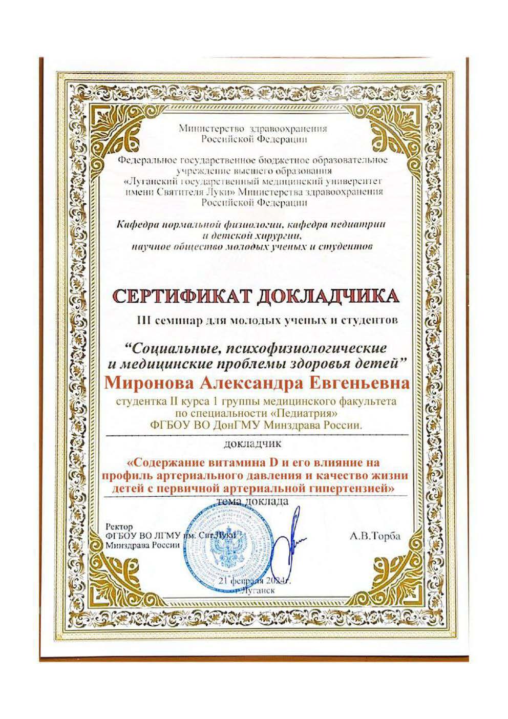 В работе студенческого научного общества активное  участие принимает весь профессорско-преподавательский состав кафедры педиатрии